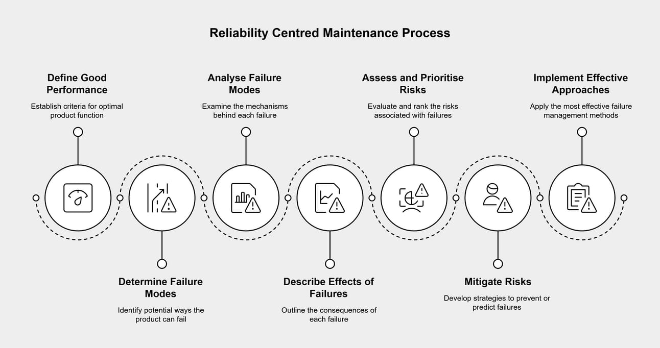 The full standard on Reliability Centred Maintenance (SAE JA1011) is proprietary but there are many more in-depth articles if you want to learn more about the process SAE JA1011 Standard