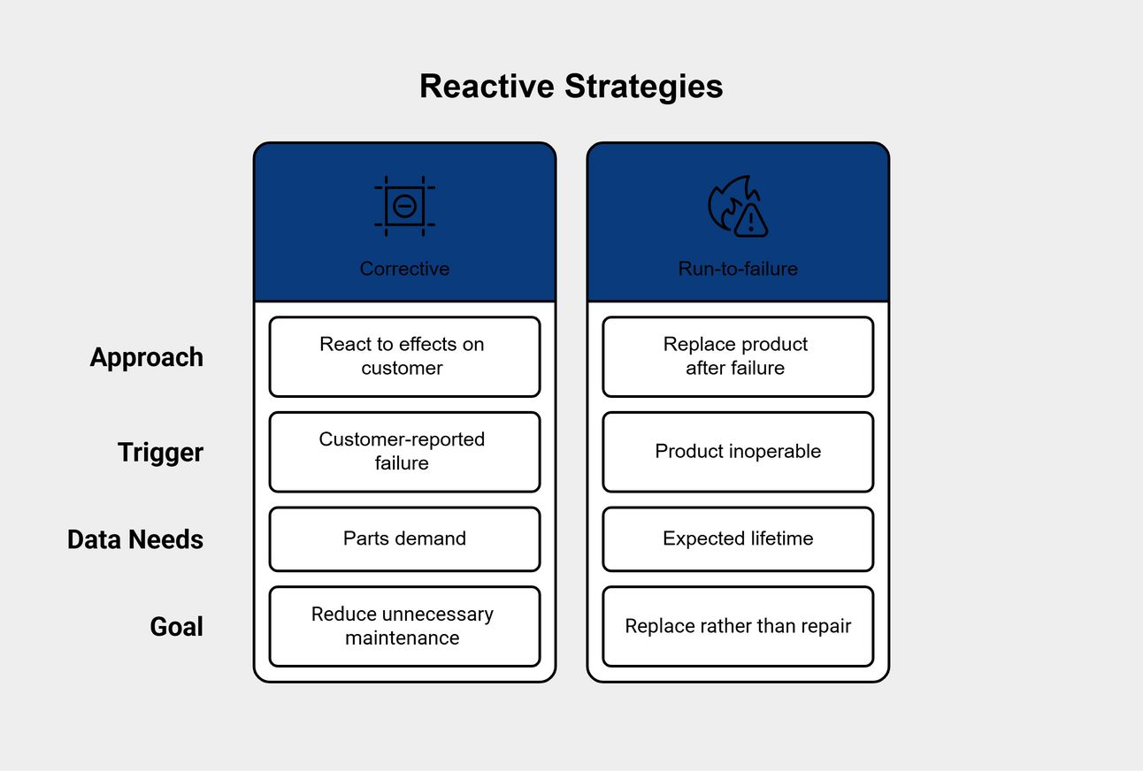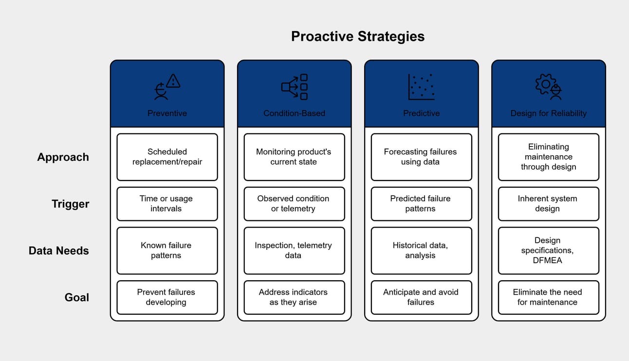 Predictive – failure patterns in the population or in the history of that specific product may be used to predict failures before any observable signs can be determined. This requires significant data collection and analysis to show results.
